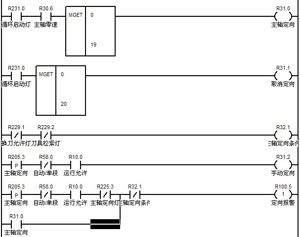 ????? 主軸定向功能可以通過M代碼開始,也可以通過手動方式下面板的按鍵開始。定向的開始條件為主軸轉(zhuǎn)速必須處于零速度。主軸定向開始時將通過置主軸定向標(biāo)志G402.12,定向完成以后通過清除該標(biāo)志來取消定向,以便下一次定向的開始。如果換到松緊燈亮?xí)r,不允許主軸定向,否則報警。