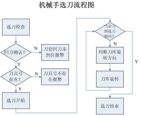 ?????? 機(jī)械手動作基本流程可以分解為選刀過程和換刀過程,選刀動作必須在換刀動作之前完成。選刀動作主要是負(fù)責(zé)選取指定的刀號的刀具,旋轉(zhuǎn)刀庫到指定刀具位置,然后等待換刀動作開始。換刀動作主要負(fù)責(zé)將刀庫上選定的刀具和主軸上的刀具進(jìn)行交換的動作。