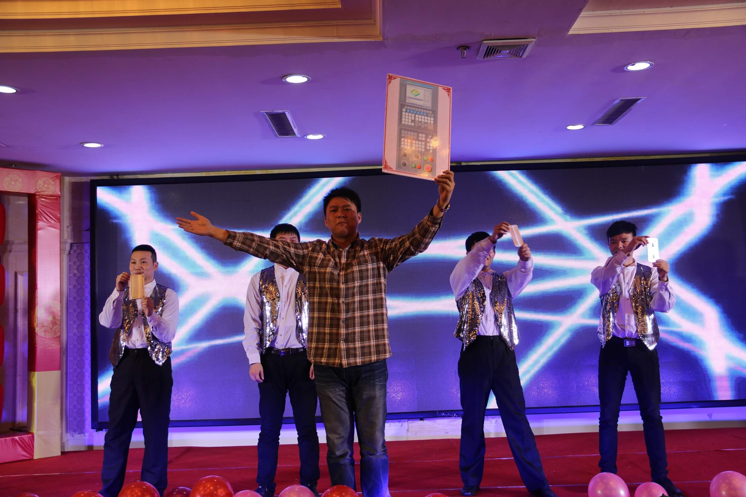 2017年1月19日,為總結全年經營工作,彰顯成績,提振士氣,表彰優秀員工與團隊,宣導優秀員工及集團事跡,倡導積極向上、團結協作的企業文化精神,華中數控隆重舉辦2016表彰大會暨2017迎新聯歡會,大會以“創新、拼搏、跨越、勝利”為主題,大會由董事長致辭、表彰環節、文藝匯演三部分組成。大家歡聚一堂,共同慶祝華中數控2016年取得的成績,共同展望更好的2017年。陳吉紅董事長,田茂盛副總裁、朱志紅副總裁、熊清平副總裁、李社林副總裁、李軍副總裁等出席晚會。