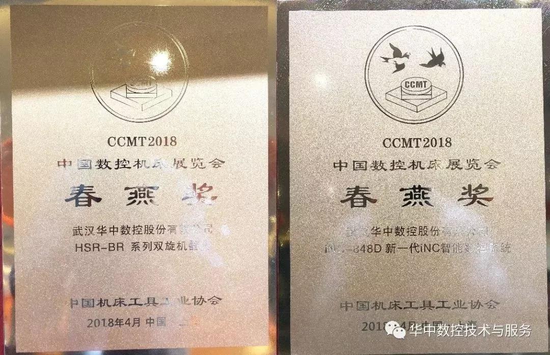 2018年4月9日下午,CCMT2018展會開幕當天,中國機床工具工業(yè)協(xié)會舉辦了“春燕獎”頒獎儀式。華中數(shù)控憑借iNC智能化數(shù)控系統(tǒng)和BR系列雙旋機器人兩項展品光榮入選CCMT2018春燕獎。