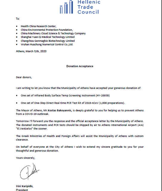當(dāng)前,新冠肺炎疫情正在全球多個(gè)國家蔓延擴(kuò)散。截止3月20日,希臘共和國累計(jì)確診新冠肺炎病例增加到近500例。面對(duì)新冠疫情快速蔓延,希臘共和國總理米佐塔基斯稱“希臘處于戰(zhàn)爭狀態(tài),但我們必將獲勝”。他強(qiáng)調(diào)當(dāng)前希臘政府的首要任務(wù)是“挽救生命”,希臘共和國政府已經(jīng)出臺(tái)一系列措施進(jìn)行防疫抗疫。3月20日,在中華環(huán)境保護(hù)基金會(huì)的協(xié)調(diào)下,武漢華中數(shù)控股份有限公司(簡稱華中數(shù)控)通過希臘共和國駐中華人民共和國大使館,向希臘共和國捐贈(zèng)一臺(tái)HY-2005B紅外智能測溫儀,支援希臘共和國政府開展防疫抗疫工作。為此,雅典市市長專門發(fā)來感謝信,感謝華中數(shù)控為希臘疫情防控提供幫助,據(jù)悉,本次捐贈(zèng)的紅外智能測溫儀將用于雅典國際機(jī)場海關(guān)旅客的體溫檢測。