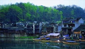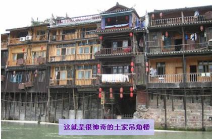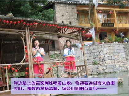 那湘人深諳經(jīng)商之道,怕我們泛舟枯燥影響雅興,居然在江中設(shè)一對歌臺于龍舟上。舟上眾多美女著民族服飾不斷唱山歌輪番“挑逗”游客,我們一激動便讓船老板教我們和起了山歌。那時候什么斯文形象、什么旅途疲憊、什么時間觀念,哈哈!統(tǒng)統(tǒng)地拋在腦后。到得岸邊,一行人樂呵呵都說不虛此行!以至于回到故鄉(xiāng)N日了,鳳凰古城那碧綠的江水、江中暢游的漁舟、江畔吊腳樓的裊裊輕煙,以及兩岸浣紗山姑的朗朗笑聲,就像蒙太奇似地總是在腦海里不斷疊現(xiàn)……