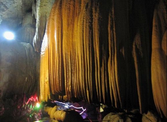 跟著導游走了沒多遠,就上了游艇。游艇在昏暗的燈光指引下慢慢向洞的深處游去,一個個奇異造型的鐘乳石映入眼簾,在燈光的照射下發出璀燦的光芒。游客們都發出嘖嘖的贊嘆聲。感嘆大自然的神奇。